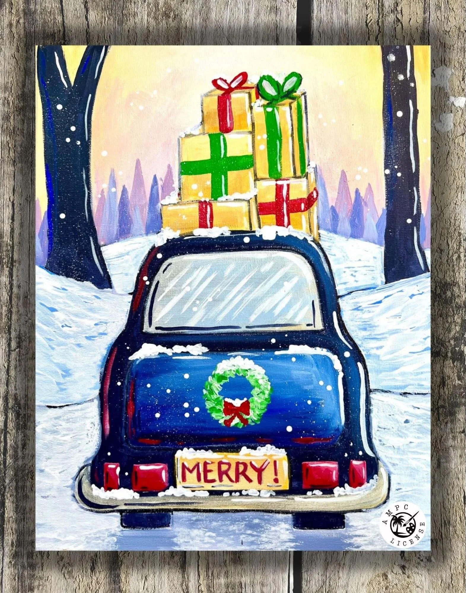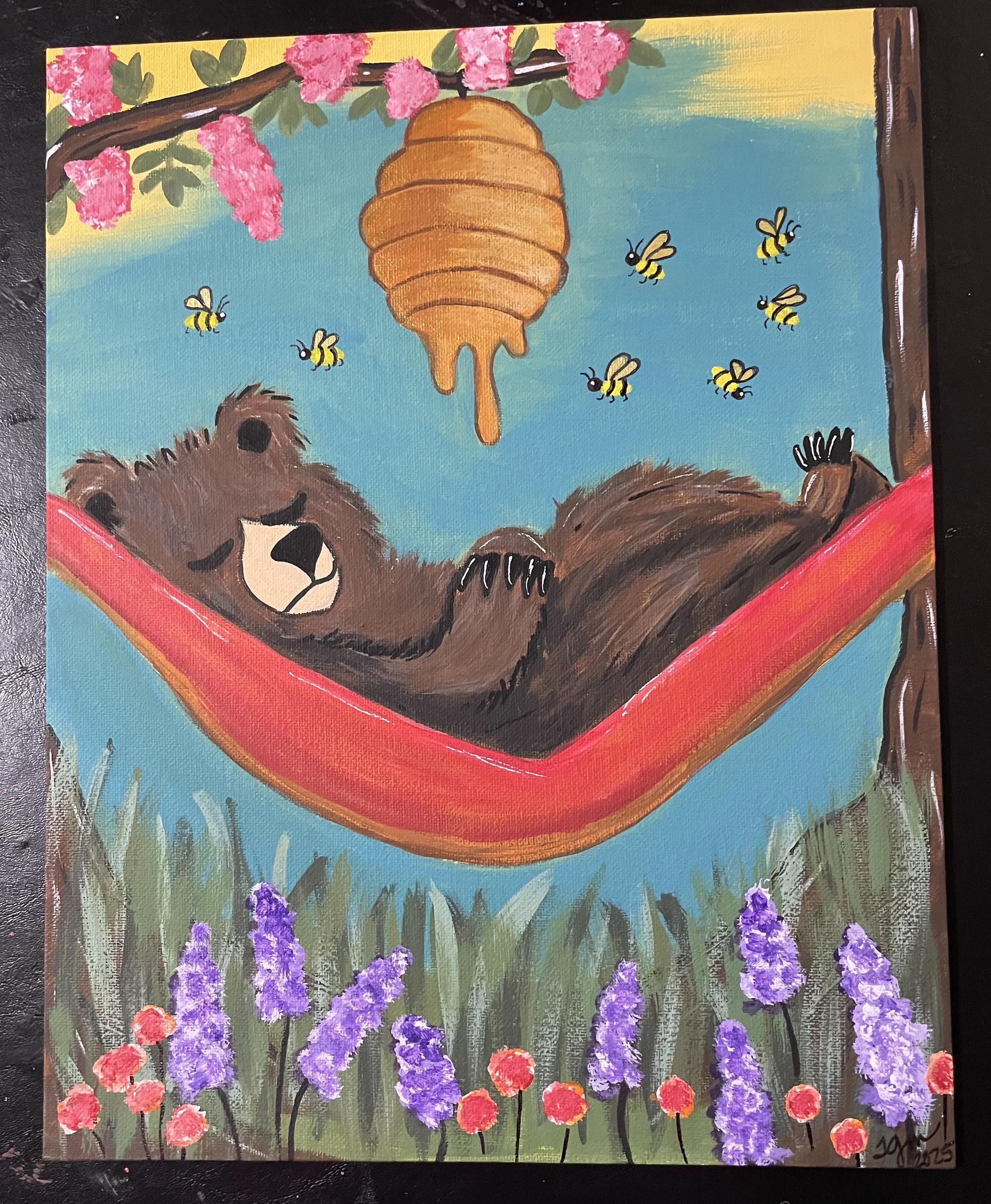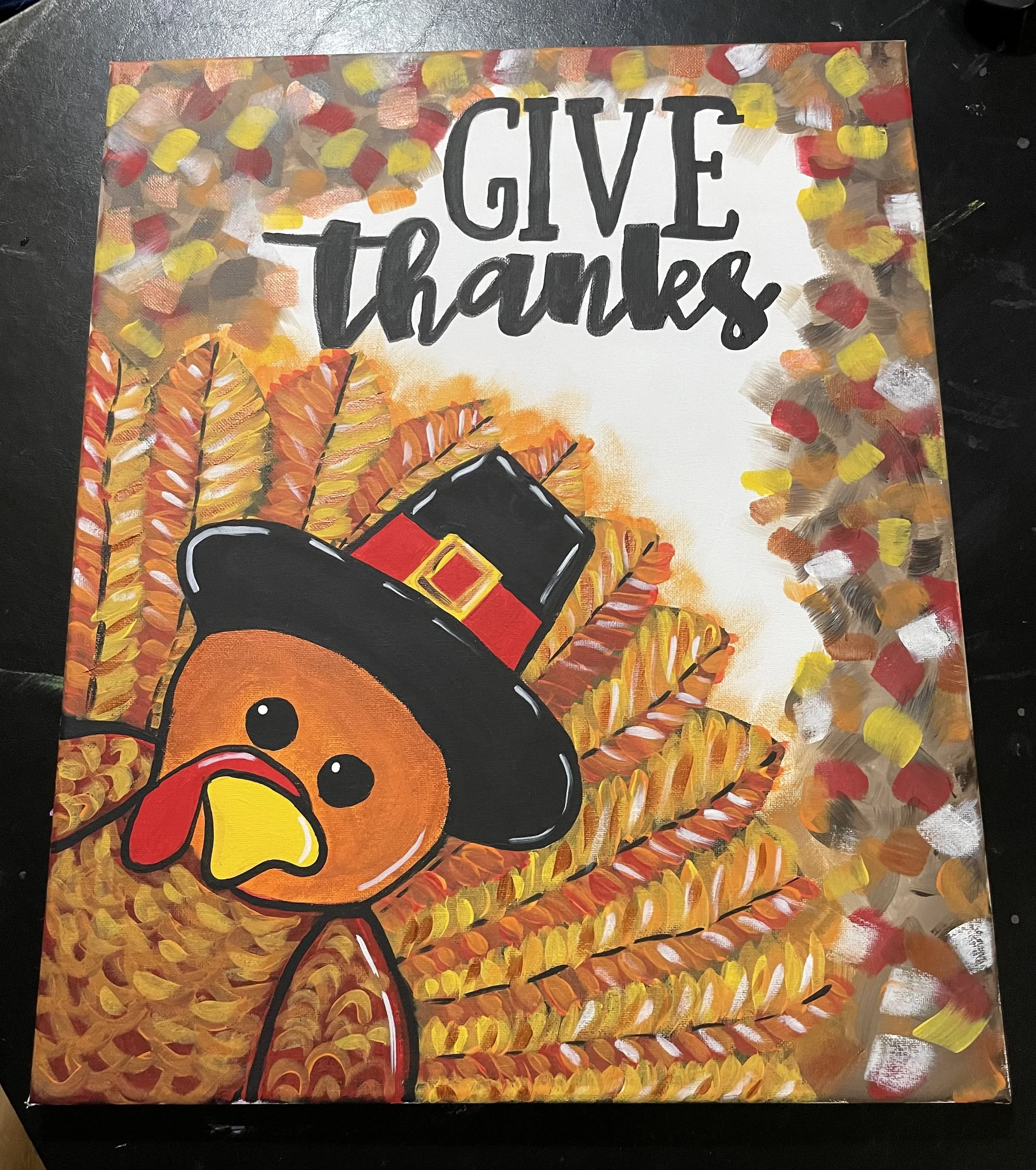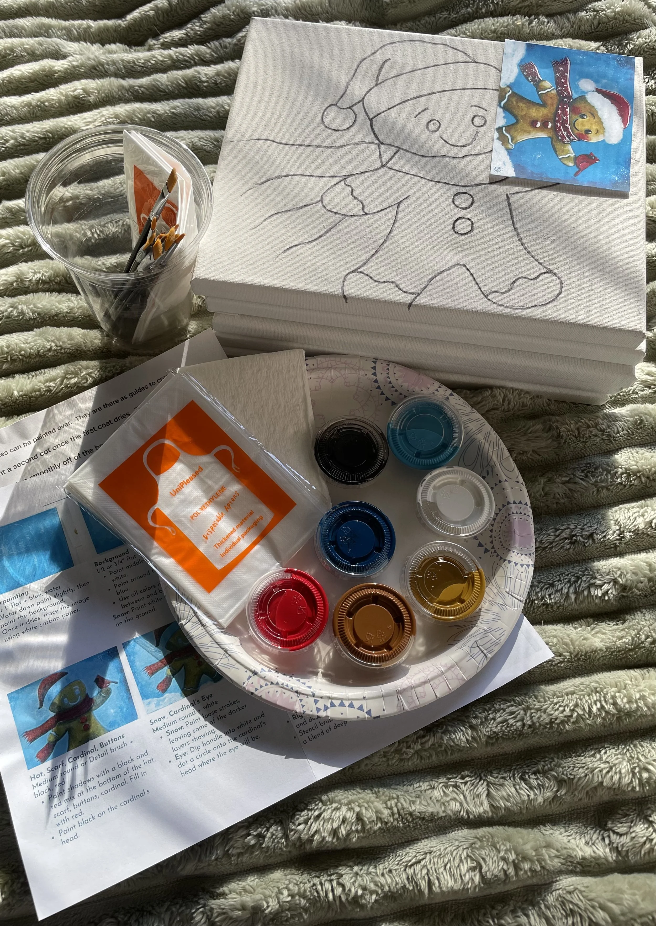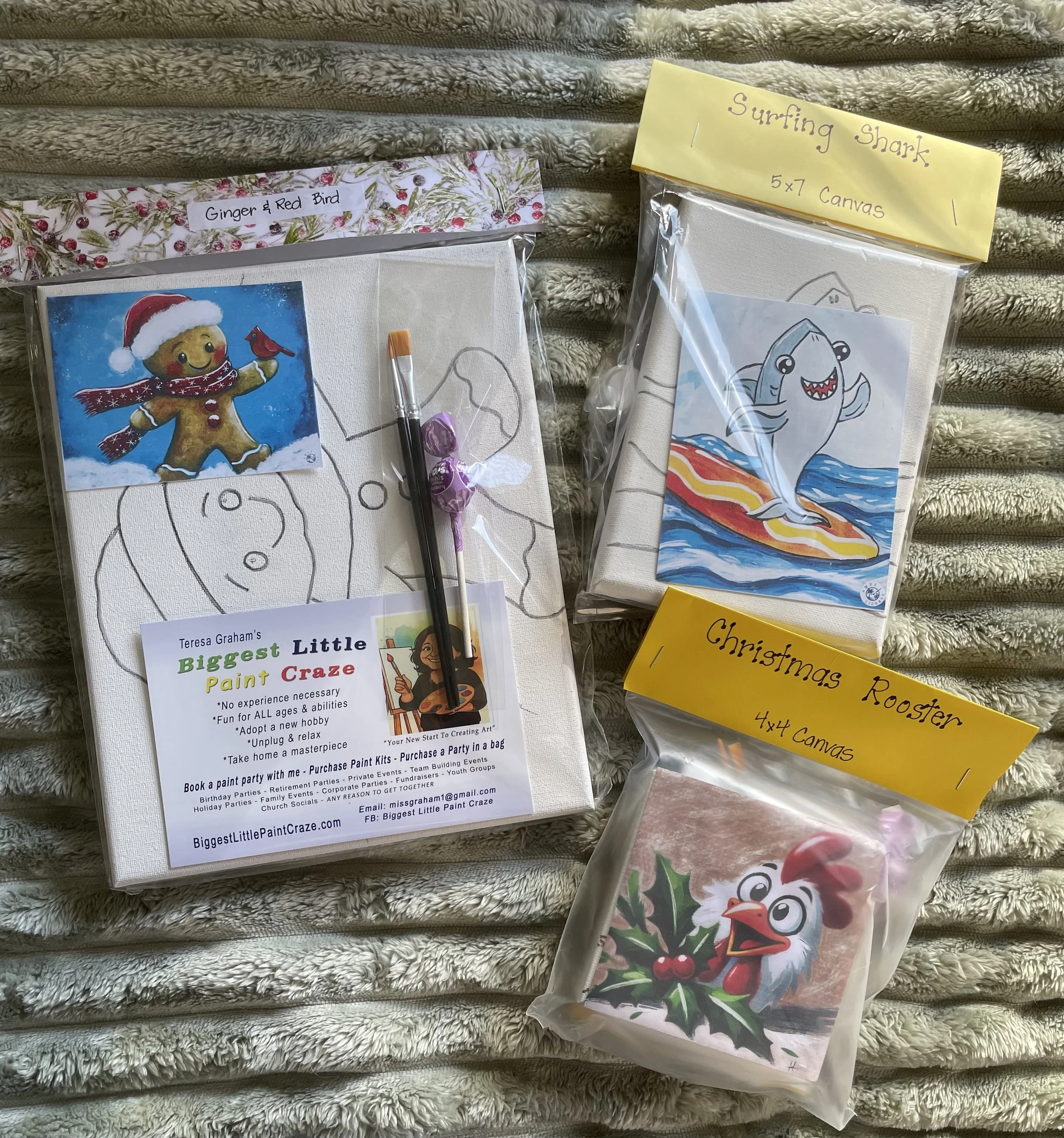 Individually packaged paint kits containing everything needed to create your masterpiece…except a cup of water to rinse your brushes! Your kit will include a pre-traced canvas, paint, 2 paint brushes, a disposable apron, a heavy napkin to wipe brushes, paper plate palette, step by step directions and a list of helpful painting tips.
